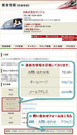各業者様の詳細ページに、電話番号、メールアドレス、お問い合わせフォーム等の連絡方法をご用意しておりますので、ご利用ください。